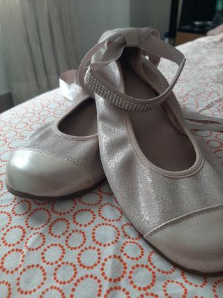 Bailarinas de niña, color rosa , puntera imitación piel el resto del tejido rosa metalizado. Con cinta en el tobillo para mayor sujeción. Pulsera de perlitas y lazo zapatero para hacer con la cinta. Quedan fantásticas para comunión o invitada de un evento. Usadas en 1 ocasión Precio tienda 39.90