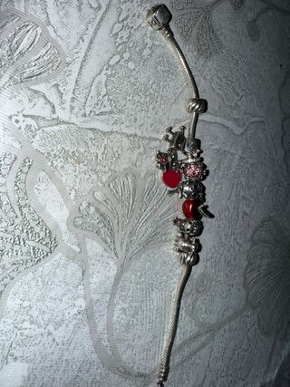 Pulsera Pandora original con varios charms. - Charm de robot con corazón rojo. - Charm de pareja abrazándose con corazón. - Charm de manzana roja. - Charm de calavera. - Charm de cara de mono. - Charm de bola con piedras rojas.