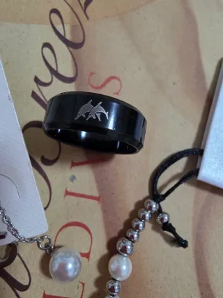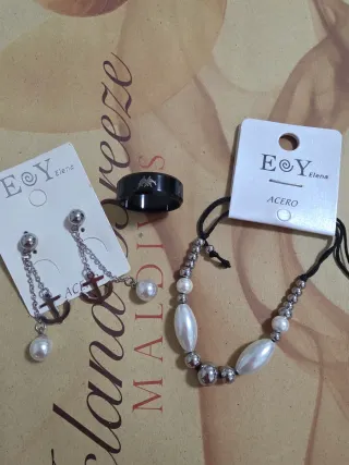 Conjunto de joyería de la marca Eoy Elena con temática marina. - Incluye un par de pendientes con ancla y perla. - Un anillo negro con diseño de delfines. - Una pulsera con cuentas plateadas y perlas ovaladas. Ideal para tener un detalle en pareja, amantes del mar. Un anillo con delfines para el y pulsera y pendientes de anclas para ella.