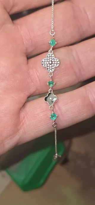 Elegante pulsera elaborada en plata de ley 925, adornada con esmeraldas naturales. 3 esmeraldas con certificado más menos 0.1 ct cada una. Regala estas navidades calidad directa desde Colombia. Ideal para parejas o para niñas. Preciosas. Dispongo de 2 iguales. Tienen certificado de autenticidad. - Esmeraldas talla brillante 0.3 ct - Diseño delicado con motivos de trébol. - Detalles en circonitas cúbicas. revisa mi perfil para más artículos de joyeria , regalos, e inversion