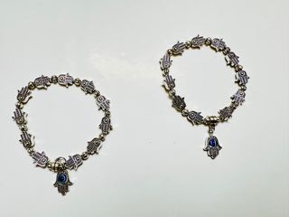 Pareja de pulseras de bisutería (metal y cristal) con diseño de mano de Fátima y Ojo Turco. Son elásticas, se ajustan con goma. Como nuevas. Precio por las dos. NO NEGOCIABLE. NO ME DESPLAZO. RECOGIDA EN MANO EN COSLADA (MADRID) O ENVÍOS POR WALLAPOP.