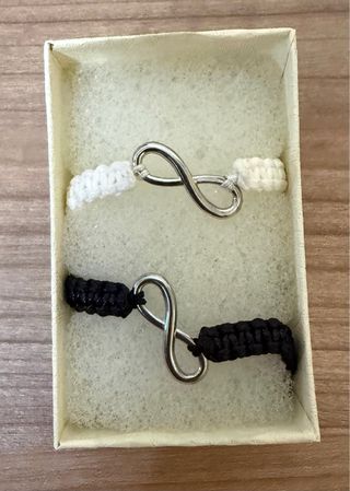 Conjunto de dos pulseras con símbolo de infinito. - Este es un par de pulseras ajustables con el símbolo del infinito, una en cordón blanco y otra en cordón negro . Ideales para parejas - Va con la cajita y están sin estrenar .