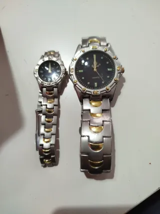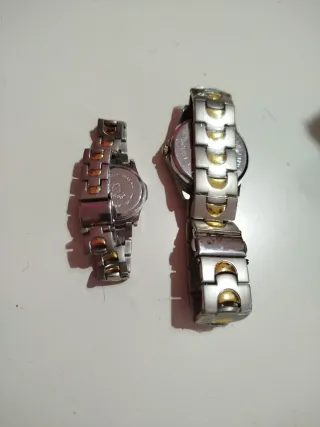 Conjunto de dos relojes de pulsera, uno de hombre y otro de mujer, con un diseño elegante y moderno. - Brazalete de eslabones combinando tonos plateados y dorados. - Esfera oscura con detalles que resaltan. - Mecanismo de cuarzo.