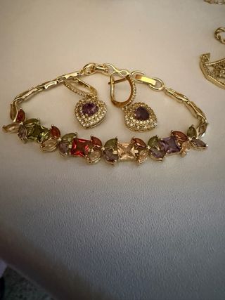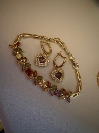Conjunto de pulsera y pendientes con detalles en forma de corazón. - Pulsera con piedras de colores y diseño floral. - Pendientes con piedra morada central y circonitas.quieres hacer un bonito regalo a tu pareja,amiga o familiar aquí estamos