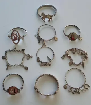 Conjunto variado de pulseras y brazaletes con diferentes diseños. - Pulsera con figura de caballo. - Brazalete con medallón de pareja. - Pulsera con símbolo de paz y motocicleta. - Brazalete con charms de llaves y notas musicales. - Pulsera con figura de bailarina. - Brazalete con charms de tijeras, raqueta y pelota. - Pulsera con figura de bailarina y medallón ovalado. - Brazalete con charms de corazón y jeringuilla. - Brazalete con forma de cadena y charms variados.