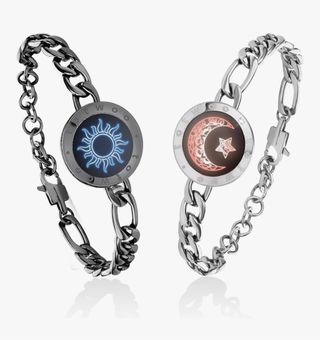 Conjunto de dos pulseras para parejas, una con diseño de sol y otra de luna. - Pulsera con diseño de luna y estrella. - Pulsera con diseño de sol. - Cadena de eslabones.