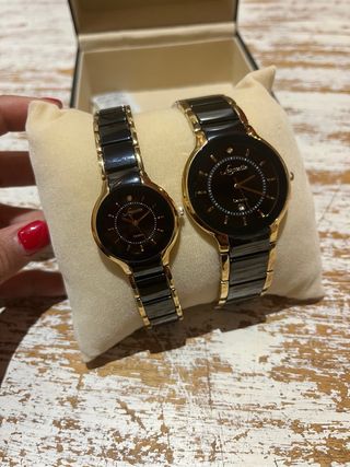 Nuevos a estrenar ✨⌚️ Modelo de hombre y de mujer, tal y como nos los regalaron para la boda. Se venden juntos, en una sola caja original. Ambos están nuevos a estrenar, sin uso, con el precinto de seguridad puesto. Incluyen eslabones extra ya montados en la pulsera, por lo que solo habría que retirarlos para ajustar a la muñeca. No dispongo de ticket ni factura porque fue un regalo, pero los relojes están totalmente nuevos, impecables y listos para estrenar. Es un conjunto elegante, ideal como regalo de pareja, boda, aniversario o para quien busque relojes de coleccionismo