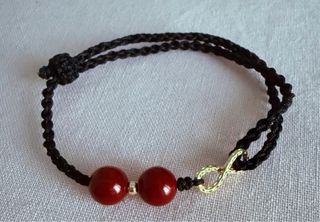Pulsera tejida a mano con detalle de infinito. - Hilo de color rojo o negro - Cuentas de color granate. - Detalle central en forma de infinito en tono dorado. Pulsera ajustable, unisex. Hecha a mano con símbolo del infinito dorado y hilo rojo o negro con abalorios. Queda muy bonita puesta. Se puede usar como amuleto protector para atraer la buena suerte y simbolizar un vínculo eterno y sin fin. Ideal para ti o tu pareja, para amigos o familia. Se venden por separado. Una unidad 8€ - 2 unidades 14€.
