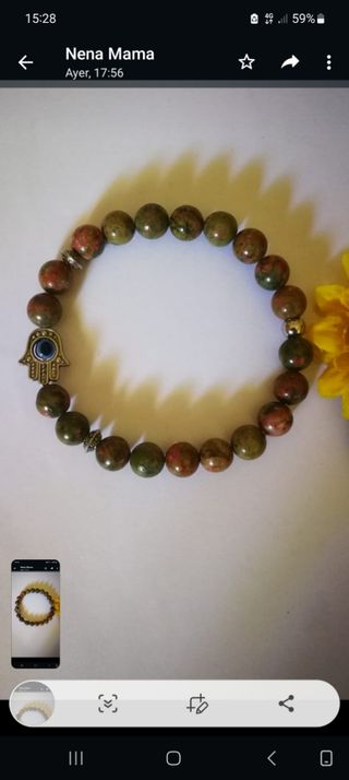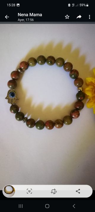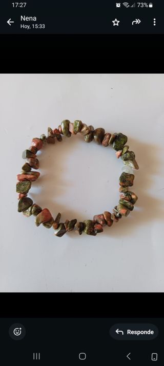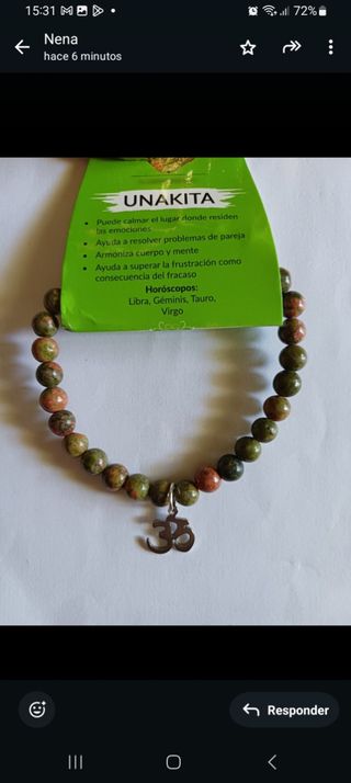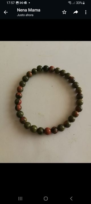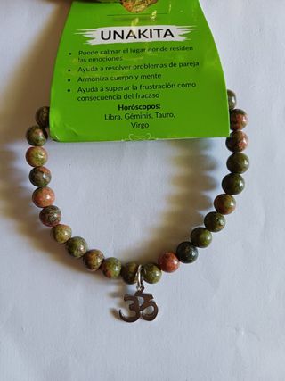 Unakita. Piedra que armoniza cuerpo y mente.Ayuda a resolver problemas de pareja. Ayuda a superar la frustración como consecuencia del fracaso. Es utilizada para la meditación, es ideal para ayudar a reparar las heridas del corazón.Calma las emociones negativas. Piedra de visión y transformación. Aporta equilibrio y favorece la sanación física y energética.Ayuda a limpiar bloqueos permitiendo potenciar el crecimiento personal y espiritual . Esta pulsera lleva bolas de 6mm y mide 19cm. Tengo diferentes medidas