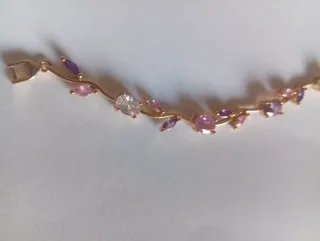 Elegante pulsera con un d delicado y brillante. - Cristales de imitación en tono rosa. - Engarce metálico en color plata. Entrego en mano.