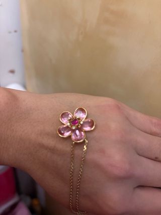 Elegante pulsera con diseño de flor. - Detalle central en color fucsia. - Pétalos en cristal rosa. - Cadena dorada.