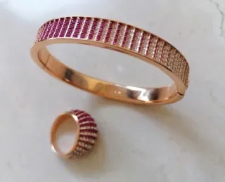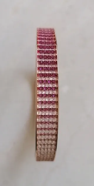 Elegante pulsera de la marca Swarovski con un diseño llamativo. - Montura en oro rosa. - Cristales situados a 90 grados para crear un efecto de cambio de color en distintas tonalidades de rosas y blancos. - Anillo a conjunto disponible en mi perfil. - Se envía sin su caja, en bolsita de joyeria de El Corte Inglés.
