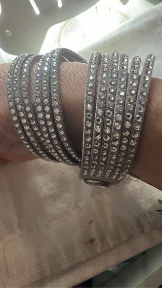 Pulsera original de Swarovski en color gris con cristales brillantes. Es modelo multivuelta de ante con cierre a presión y logo grabado. Está completamente nueva, nunca usada. Los cristales están perfectos y brillan muchísimo. Ideal para llevar sola o combinada con otras pulseras. Muy elegante y versátil, combina con todo. Se entrega tal cual se ve en las fotos. Precio negociable razonablemente