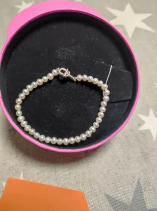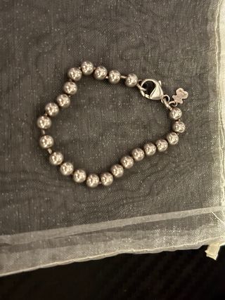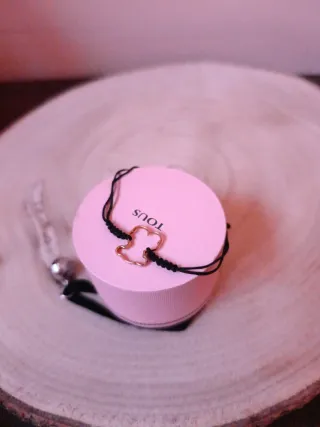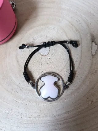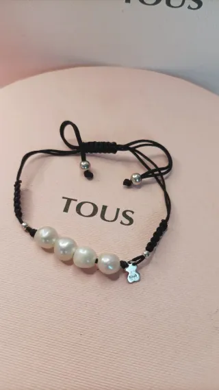 Pulsera de la marca Tous con perlas y detalles plateados. - Diseño ajustable con cordón negro. - Cuatro perlas blancas. - Charm de oso Tous. - Cierre con nudos. Origuinal de tous No tengo certificado
