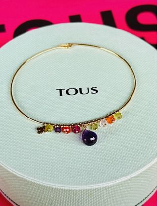 Preciosa pulsera TOUS de oro amarillo de 18kt con gemas de colores y bolitas de oro. Es una belleza, muy elegante. Colección: Caprice. Descatalogada. -Nueva con caja Tous. - Lleva gemas de colores, amatista, cuarzo, etc. - Tiene un amatista central en forma de lágrima. -Medida 6cm diametro. -Se entrega con caja Tous.