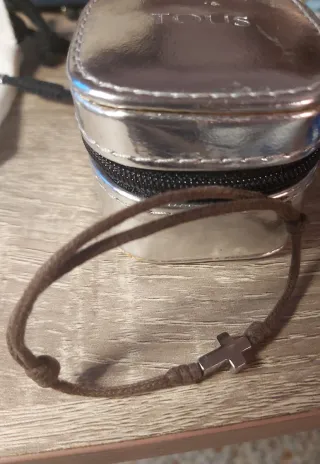 Preciosa pulsera Tous con dije de cruz. Es de color marrón y plata, y tiene un diseño sencillo y elegante. - Cordón de cuero marrón. - Dije de cruz en metal plateado.