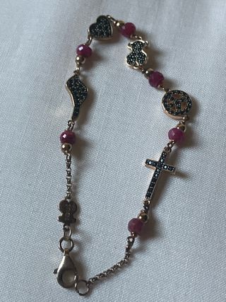 Elegante pulsera de la marca Tous, elaborada en plata. Presenta una combinación de dijes que incluyen un corazón, un oso, una cruz y un ala, adornados con pequeñas piedras negras. También incluye cuentas de color granate y un dije circular con un diseño distintivo. - Dijes variados: corazón, oso, cruz, ala y círculo. - Detalles en piedras negras. - Cuentas de color granate.