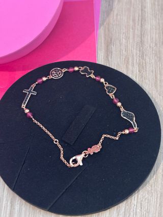 Elegante pulsera de la marca Tous con un diseño de cruz. - Cruz central con incrustaciones negras. - Detalle de pequeña piedra rosa. - Cadena fina en tono rosado.