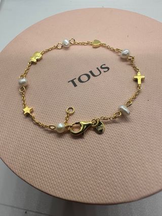 Elegante pulsera de la marca Tous, con un diseño delicado y femenino. - Cadena dorada. - Detalle de perlas blancas. - Charm de corazón. - Charm de estrella. - Charm de mariposa. - Charm de cruz. 18 , cm