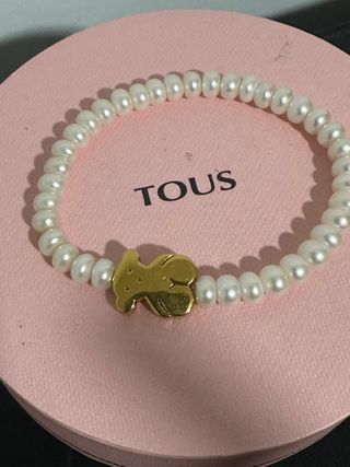 Elegante pulsera de la marca Tous, elaborada con perlas y oro de 750 quilates. - Diseño delicado con perlas blancas. - Charm o colgante con forma de osito. - Acabado en oro brillante. - Es el tamaño mas grande de oso ver medidas en fotos con caja sin certificado