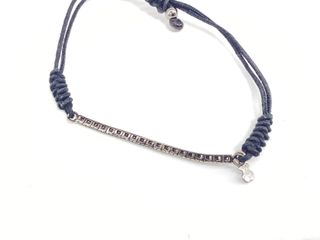 Pulsera de hilo negra con detalles plateados y un charm. - Charm con forma de flor y piedra central. - Cierre ajustable.