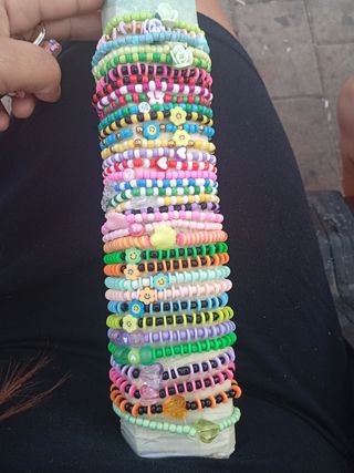 Preciosa colección de pulseras hechas a mano. Son muy coloridas y alegres. - Ideales para añadir un toque de color a cualquier atuendo. - Un total de 20 pulseras incluidas en la venta. - Están elaboradas con cuentas de colores brillantes.