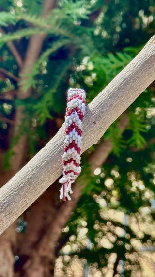 Pulsera tejida a mano con colores rojo, blanco y verde. Sus colores añaden carácter y personalidad a tu estilo. - Diseño trenzado. - Colores vibrantes.