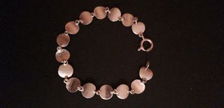 Elegante y original pulsera elaborada en plata de primera ley, con sello grabado de 925 Su diseño se compone de eslabones circulares en forma de moneditas abonadas de 1cm de diámetro, combinando plata brillo y mate . Largo 19 cm. Cierre de mosquetón, seguro. Usada , muy bien conservada, en perfecto estado.