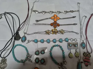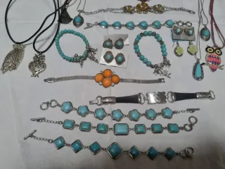 Conjunto variado de 23 piezas de bisutería, incluyendo collares y pulseras. - Diseños con detalles de búhos y motivos florales. Entre otros. - Algunas piezas presentan incrustaciones de piedras turquesa. - Incluye un collar con colgante de pluma. - Variedad de estilos y tamaños.