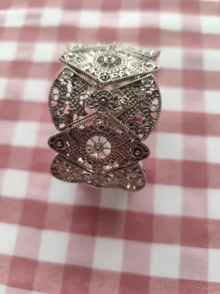 Elegante pulsera con un diseño detallado y plateado. - Diseño calado con motivos ornamentales. - Pieza central con un pequeño detalle. - Estilo elástico para un ajuste cómodo.