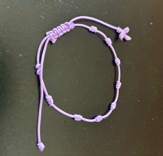 Pulseras hechas a mano en hilo, representando el Rosario en pulsera. Son ajustables y hay en varios colores.