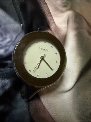 Reloj de pulsera con un diseño llamativo y moderno. - Correa de silicona azul. - Esfera blanca con detalles. - Dibujo de teléfono retro en la esfera. - Indicadores y manecillas plateadas.