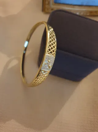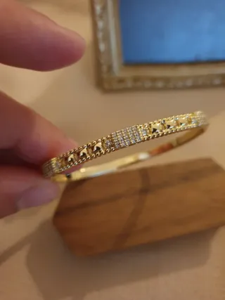 Elegante pulsera chapada en oro, con un diseño intrincado y detalles en plata. Viene presentada en su caja original, lista para regalar o para añadir a tu colección. - Diseño calado con motivos florales. - Combinación de tonos dorados y plateados.