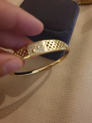 Elegante pulsera chapada en oro, a estrenar y presentada en su caja original. - Diseño con detalles de rejilla y pequeños adornos. - Incluye caja para regalo o conservación.
