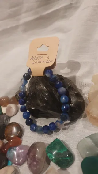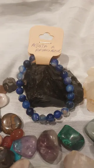 Pulsera de piedras naturales de ágata con un diseño de rayas en tonos azules y multicolor. Las cuentas son de 8mm. Piedra: Ágata.Diseño: Rayas - Tamaño de las cuentas: 8mm.La ágata a rayas azules (frecuentemente conocida como ágata de encaje azul o blue lace agate) en el contexto del amor y las relaciones se considera una piedra de armonía, comunicación honesta y calma emocional. Se utiliza para fortalecer los vínculos amorosos mediante la comprensión mutua y la reducción de tensiones.