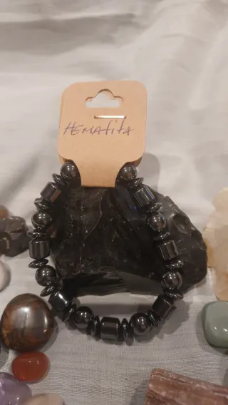 Pulsera elaborada con cuentas de hematita, una piedra natural conocida por su brillo metálico. El diseño combina cuentas esféricas y rectangulares, creando un patrón interesante.Cuentas de hematita. - Diseño con formas variadas.La hematita, en el contexto del amor y las relaciones, actúa principalmente como una piedra de equilibrio emocional, protección y anclaje. Ayuda a estabilizar las emociones, disolver tensiones y fortalecer la confianza en uno mismo, lo que permite construir relaciones más saludables y estables.