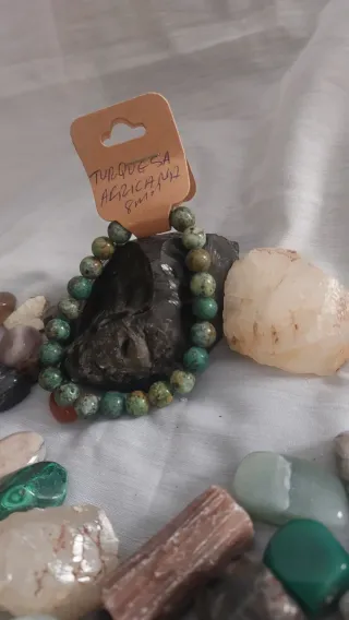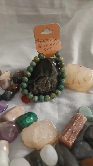 Pulsera elástica hecha con piedras naturales de turquesa africana.Piedras de 8 mm de diámetro. - Diseño único y artesanal.La turquesa africana es conocida espiritualmente como la "piedra de la evolución", simbolizando el crecimiento personal, la transformación positiva y los nuevos comienzos. Se asocia con el chakra del corazón y la garganta, fomentando la comunicación clara, la empatía, la autoexpresión y la calma interna.