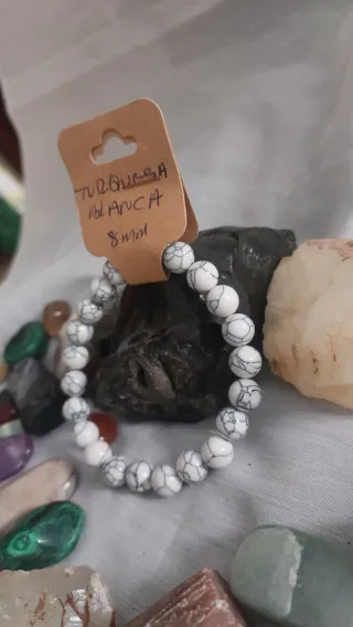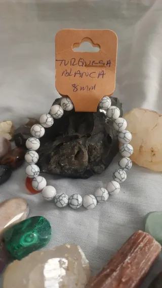 Pulsera de piedras naturales Turquesa Blanca.Piedras de 8mm de diámetro. - Diseño con veteado característico.La turquesa blanca, a menudo identificada como howlita blanca o turquesa con matriz blanca, es una piedra de alta vibración espiritual enfocada en la calma, la purificación mental y la conexión con la sabiduría superior. Simboliza la paz interior, ayuda a eliminar la ira y la negatividad, promueve la comunicación asertiva y facilita la meditación profunda al calmar la mente.