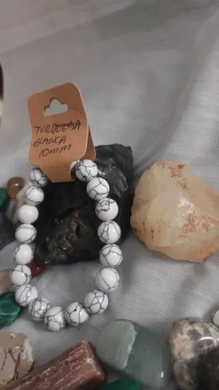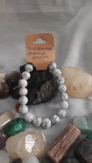 Pulsera de cuentas de turquesa blanca con un tamaño de 10mm.Diseño con vetas negras. - Piedra natural.La turquesa blanca, a menudo identificada como howlita blanca o turquesa con matriz blanca, es una piedra de alta vibración espiritual enfocada en la calma, la purificación mental y la conexión con la sabiduría superior. Simboliza la paz interior, ayuda a eliminar la ira y la negatividad, promueve la comunicación asertiva y facilita la meditación profunda al calmar la mente.