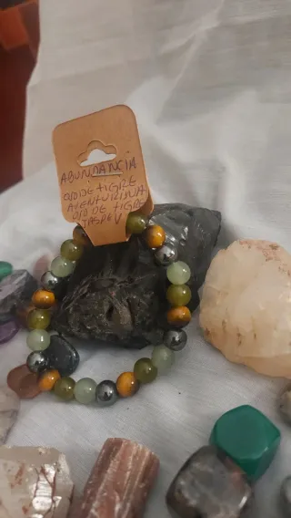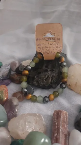 Pulsera de piedras naturales con cuentas de 8mm. Piedra Ojo de Tigre - Piedra Aventurina - Piedra Jaspe. La combinación de hematita, ojo de tigre, aventurina y jade crea un amuleto energético potente, diseñado para brindar equilibrio entre la protección, la fuerza personal, la prosperidad y la sanación emocional. Esta mezcla actúa tanto para enraizar como para abrir el corazón a nuevas oportunidades.