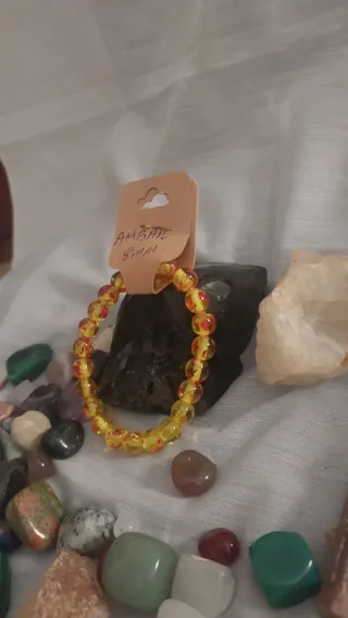 Pulsera de cuentas de ámbar natural. Cuentas de 8mm. - Diseño con incrustaciones rojas.El ámbar, una resina fósil cargada de energía solar, es considerado espiritualmente como un poderoso amuleto de protección, limpieza áurica y equilibrio emocional. Se le asocia con la fuerza vital, la creatividad, la buena suerte y la capacidad de transmutar energías negativas en positivas, siendo ideal para la meditación, la conexión interior y la armonía.