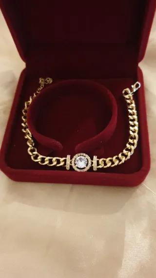 Elegante pulsera chapada en oro, ideal para complementar cualquier atuendo. Viene con su caja original. - Diseño con eslabones y detalles brillantes. - Acabado en tono dorado.