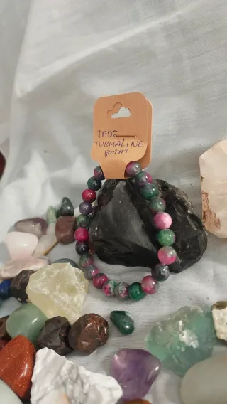 Pulsera de piedras naturales Jade Turmalina. - Tamaño de las cuentas: 8mm. - Combinación de tonos verdes y rosados.El jade es una piedra sagrada asociada espiritualmente con la sabiduría, la paz interior, la protección y la prosperidad. Actúa como un amuleto de buena fortuna, promoviendo la armonía emocional, el equilibrio del chakra del corazón y la sanación emocional. Tradicionalmente, simboliza la pureza, la longevidad y la conexión entre el cielo y la tierra.