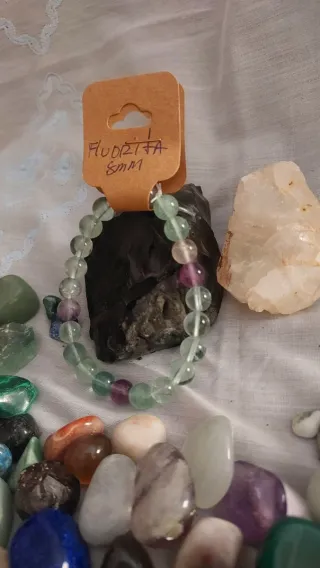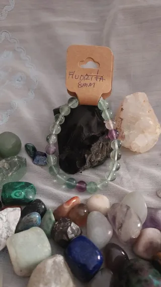 Pulsera elaborada con cuentas de piedra natural de fluorita. Tamaño de las cuentas: 8mm. - Combinación de tonos verdes y púrpuras.La fluorita es una piedra espiritual de limpieza, equilibrio y protección, conocida por ordenar la mente y elevar la vibración energética. Se le denomina la "piedra del genio" por potenciar la claridad mental, la concentración y la toma de decisiones. Esta gema ayuda a liberar bloqueos, purificar el aura y conectar con la intuición, vinculándose principalmente con los chakras del tercer ojo y corazón.