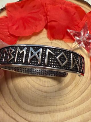 Brazalete con diseño de runas vikingas y símbolo central. - Diseño con runas antiguas. - Símbolo central estilo brújula. - Acabado en plata y negro. Es Acero y es ajustable a la muñeca. PEDIDO MÍNIMO PARA ENVÍO 10€. Revisen mi perfil para ver más joyas. Regalo sorpresa a partir de 25€ de compra