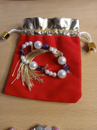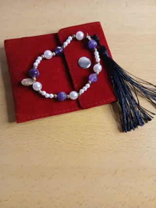 Elegante pulsera con cuentas de amatista y perlas. Medalla san benito - Diseño con cuentas de amatista. - Abalorios de perlas. - Detalle de cuentas doradas. - Adorno con borla negra.