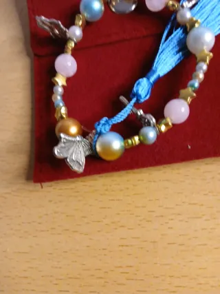 Pulsera artesanal con una variedad de abalorios y dijes. - Dijes de mariposa y hada. - Abalorios de cristal y metal. - Detalle de borla azul. - Cierre de mosquetón.