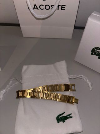 Elegante pulsera de la marca Lacoste. - Diseño de eslabones. - Acabado en tono dorado. Cualquier cosa me pueden preguntar 😊✌️
