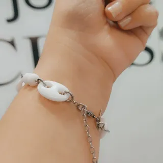Elegante pulsera con Agatha detalles en plata y eslabones blancos. - Diseño con eslabones ovalados blancos. - Conexiones y detalles en plata. Largo 18+4 cm del alargador. Precio ya en liquidación.