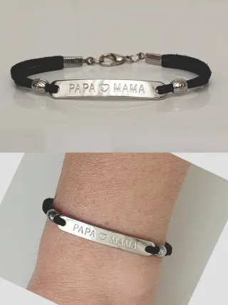 Nueva. Pulsera con cordón de ante negro y chapa de acero inoxidable. - Largo: 19 cm. - Grabado PAPA ♡ MAMA. - Cierre de mosquetón. No hago envíos recoger por mi zona.